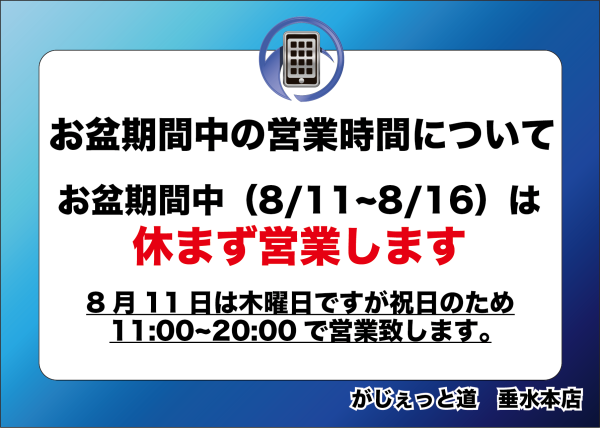 がじぇっと道ではお盆期間中は休みなく営業します。