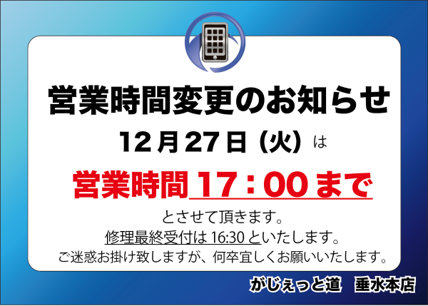 明日は営業時間が短縮となっております。 2022.12.26 こんにちは。 がじぇっと道 垂水本店のCEOの福田です。 年末年始の営業時間でご案内した通り明日は営業時間が短くなっております。 17時までの営業となりますのでご注意ください。 お急ぎの方にはご迷惑をお掛けしますがよろしくお願いいたします。 前の記事 記事一覧へ 次の記事