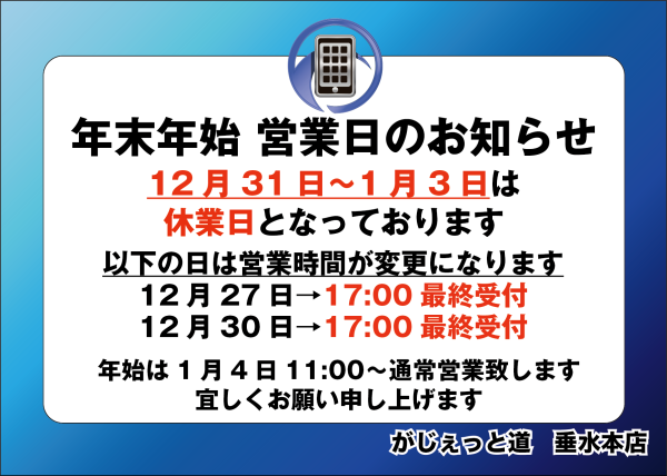 本年の営業は終了です。来年は1月4日からの営業になります。