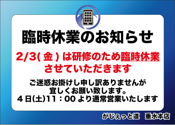 今週の金曜日は臨時休業させていただきます。 2023.01.30 こんにちは。 がじぇっと道 垂水本店のCEO 福田です。 今日は臨時休業のお知らせです。 研修のため、休業日とさせていただきます。 2/2、2/3と連休になりますのでお急ぎの方にはご迷惑をお掛けしますが宜しくお願いいたします。 前の記事 記事一覧へ 次の記事