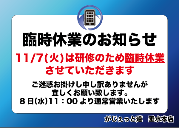 11月7日は研修のため臨時休業となります 2023.11.05 こんにちは。 がじぇっと道 垂水本店の福田です。 今日は臨時休業のお知らせです。 11月7日(火)は終日休業となります。 よろしくお願い申し上げます。 前の記事 記事一覧へ 次の記事