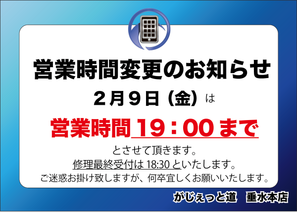 本日時短営業となります。 2024.02.09 こんにちは。 がじぇっと道 垂水本店の福田です。 本日は営業時間が短くなっております。 直前のアナウンスで申し訳ございませんが、宜しくお願いいたします。 前の記事 記事一覧へ 次の記事