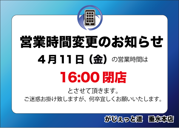 4月11日は16時までの営業となります。 2025.04.11 こんにちは。 がじぇっと道 垂水本店の代表、福田です。 4月11日は16時までの営業となります。 お急ぎの方にはご迷惑をおかけしますが、宜しくお願いいたします。 前の記事 記事一覧へ 次の記事