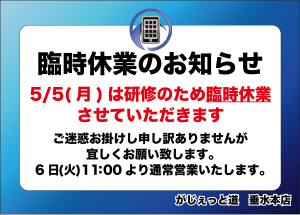 GW期間中の臨時休業のお知らせです。