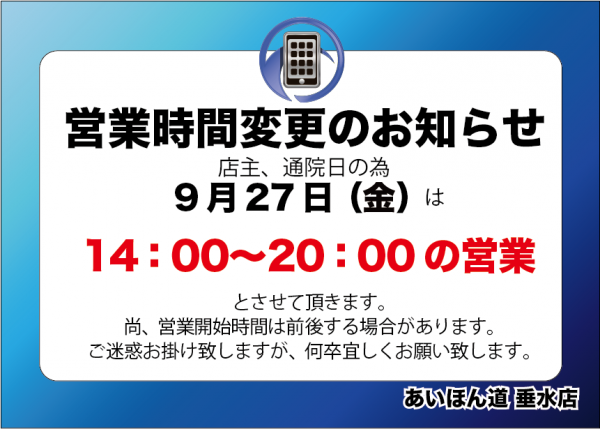 明後日は14時からの営業開始(予定)です。 2019.09.25 こんにちは。 あいほん道 垂水店の CEOの福田です。 明日は定休日、そして明後日は私の術後検診の為 14:00~営業させて頂きます。 病院の混雑具合にとっては開店が遅くなる場合がありますので 宜しくお願い致します。 さて本日の修理の様子です。 iPhone6sPlusの画面割れです。 画面交換で綺麗になりました。 その他今日はガラスフィルムの貼り付けのご依頼を頂いております。 明後日の短縮営業ではご迷惑おかけ致しますが 宜しくお願い致します。 前の記事 記事一覧へ 次の記事
