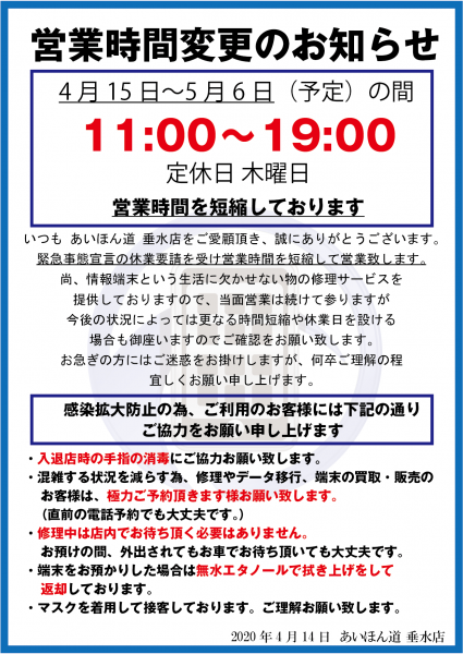更なる営業時間の短縮や休業日を設ける場合には発表させて頂きます。