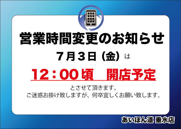 定休日明けの7/3(金)は通院日の為開店時間が変更となっております。