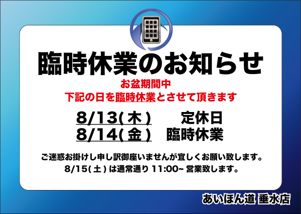 昨日もご案内した通り、13日と14日は休業させて頂きます。