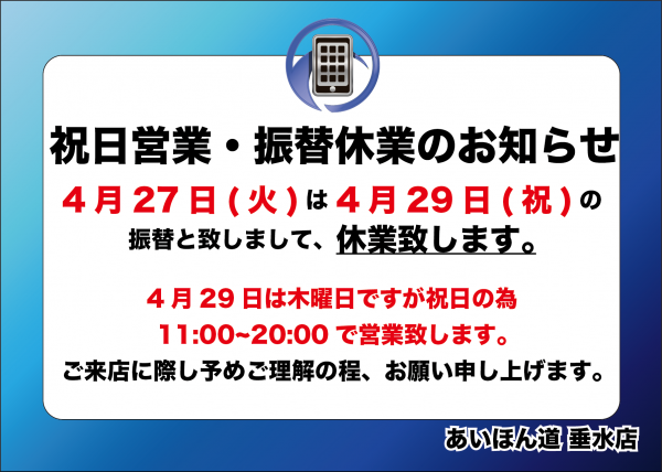 来週は営業日が変更になっております。 2021.04.21 こんにちは。 あいほん道 垂水店のCEO 福田です。 通常木曜日は定休日ですが、来週4/29(木)は祝日の為営業致します。 代わりに前々日の4/27(火)を振替休日とさせて頂きます。 お間違えないようご注意ください。 今日も修理やケースのご購入多数です。 こちらは iPhone8を画面修理とバッテリー交換・iPhone6sのバッテリー交換です。 整備して家族に譲るそうです。 3箇所の修理ですので1,500円同時修理割引となります。 明日は定休日です。 本日もご利用有難うございました。 前の記事 記事一覧へ 次の記事