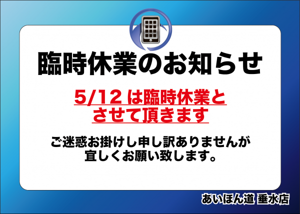 まずお知らせからですが、5月12日 水曜日は終日お休みいただきたいと思います。